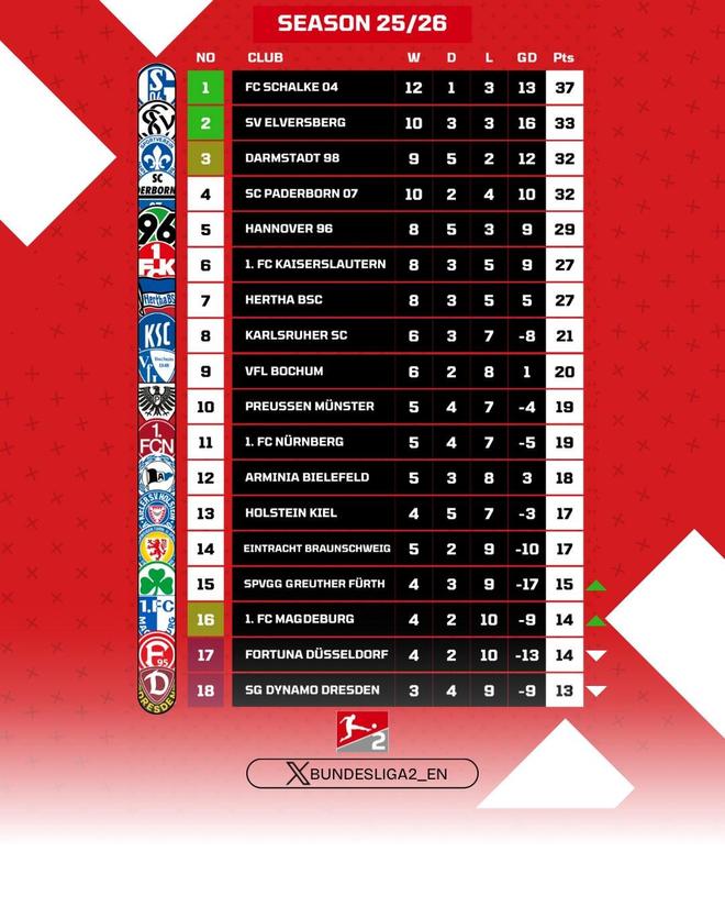 目前,沙爾克在16輪比賽過后積37分領(lǐng)跑德乙,第二名的埃弗斯堡16輪過后積33分,因此沙爾克提前一輪鎖定德乙半程冠軍。